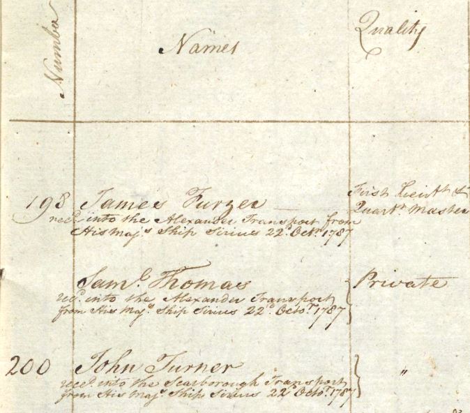 Marines of HMS Sirius supernumery list, arrived at Botany Bay Jan 1788
