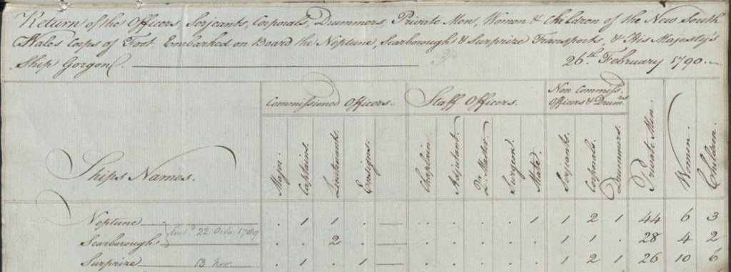 Embarkation of NSW Corps of unconfirmed Vessel, most of these likely aboard Neptune Transport to NSW – 22 Oct 1789 (due to totals per vessel)