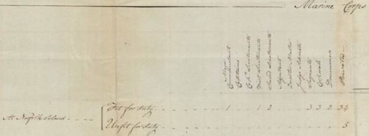 List of Marines and NSW Corps returning from Norfolk Island to Port Jackson aboard Queen Transport Nov-Dec 1791. A detailed list is not available at this time but it is known that Major Robert Ross, Lieuts Ralph Clarke, Wm Faddy & Alex Jn Ross, six NCO’s, two Drummers and 39 Ptes making up the detachment of Marines was aboard. Also Capt William Hill and 40 Rank & File of the NSW Corps detachment along with wives and children returned to the mainland after six months duty on the island. This left Capt Abbott and Ensign Prentice along with three men from Hill’s detachment who were re-enforced by Capt Paterson’s incoming detachment of three officers and 60 Rank & File who had just arrived aboard Atlantic and Queen. There were five NSW Corps officers and 103 Rank & File on the island for a short time in late Nov 1791 prior to departure of Queen